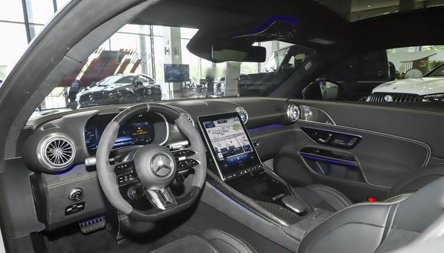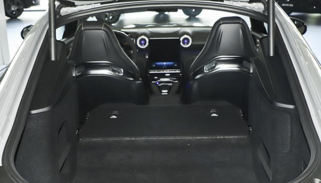 GT 63 4MATIC + 则采用双门硬顶结构,车身长度缩减至 4729mm,轴距 2700mm,车身高度降低到 1357mm。这种紧凑的比例让它的后排空间只能作为临时应急使用 —— 同样身高的乘客坐在后排,膝盖会顶到前排座椅,头部离车顶仅有两指距离,适合短途乘坐或放置物品。不过它的两座布局也有优势,减少的后排重量有助于提升操控表现,前后配重比达到更均衡的 47.3:52.7。