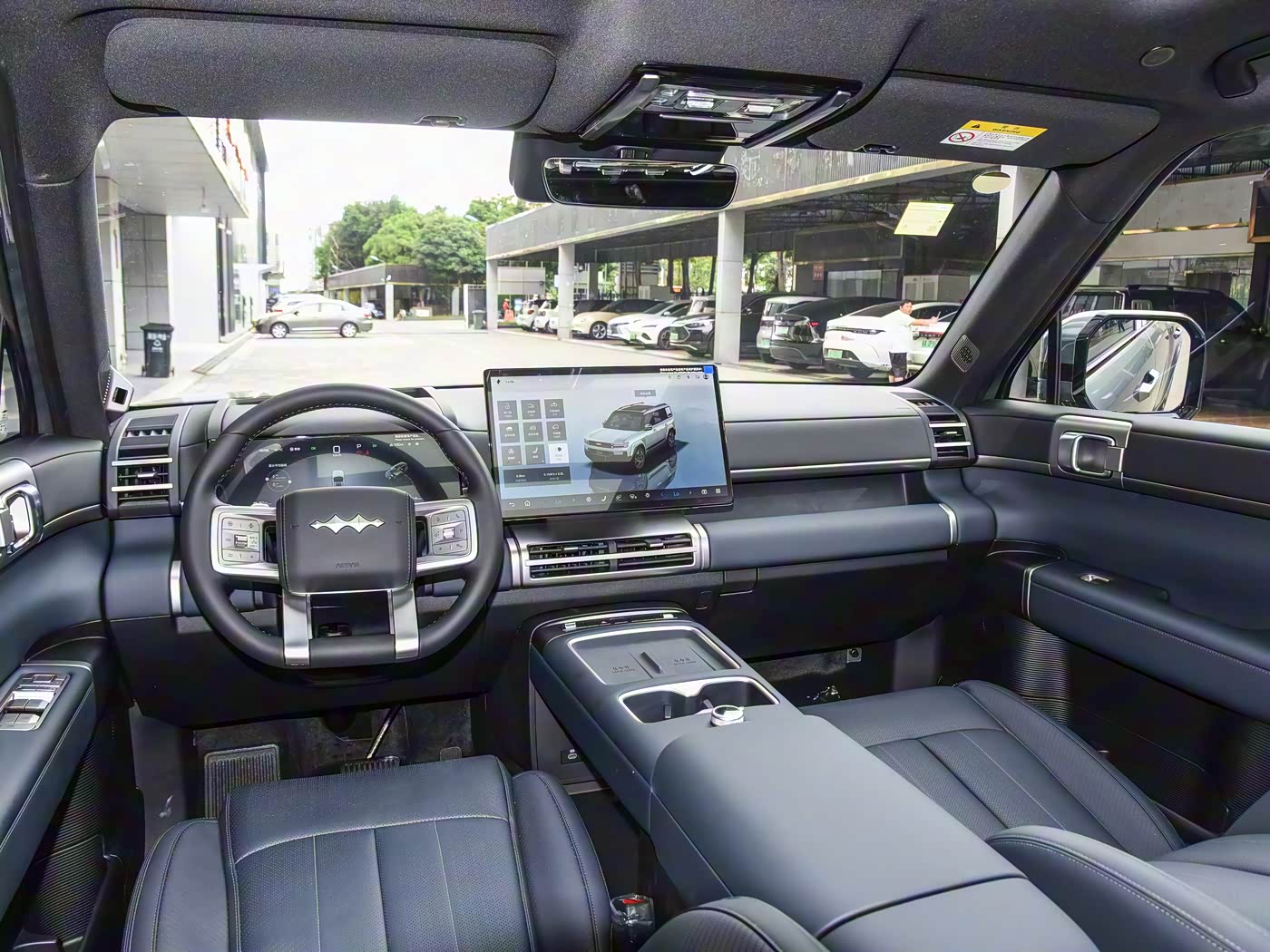 再来看车尾部分,新车的尾部整体方正而硬朗,并且采用双层方形尾灯组,多颗LED灯珠组成星际光效,中央还有着宽厚的黑色饰条连接,形成贯穿式造型,而左开式尾门配备32L液压小书包储物箱,支持干湿分离设计。而车内的654L后备箱可扩展至1880L纯平空间,下层隐藏式储物格容纳越野工具包,拖车钩支持2.5吨拖拽资质。